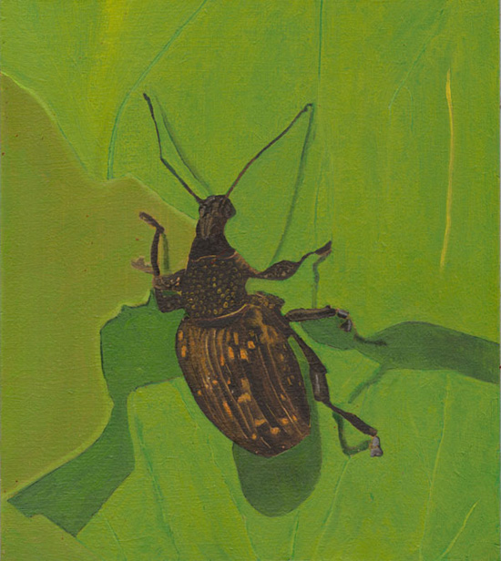 Kleine Käfermusik Nr.1 Gefurchter Dickmaulrüssler (Otiorhynchus sulcatus) 2024, Öl auf MDF, 23,5 x 21 cm